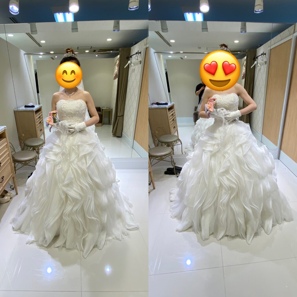 ドレスに迷ったらエステのお姉さんに写真を送って選んでもらう事!!なのですが、自分のこれだと思ったドレスを信じることは絶対に後悔しないです(笑)エステのお姉さんにも選んでもらったのですが、結局最初に一目惚れしたドレスを選びました(笑)そして再度違うドレスを試着しに行く事もしませんでした!!また迷っちゃうから(笑)
