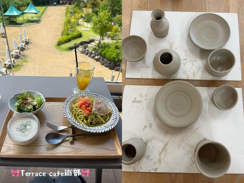 緑溢れるテラスでのランチが最高♡ソファー席でゆったりランチを楽しむ事ができます。テラスはペット同伴OK!カフェの隣はアトリエ織部で陶芸ろくろ体験ができます。1人2つまで作品を作る事ができました!体験はWEBや電話予約必須です。店員さんが丁寧に教えてくださってオリジナルのお皿や花瓶を作る事ができました!!本当に楽しかった〜ぜひ陶芸も体験してくみてださいね!