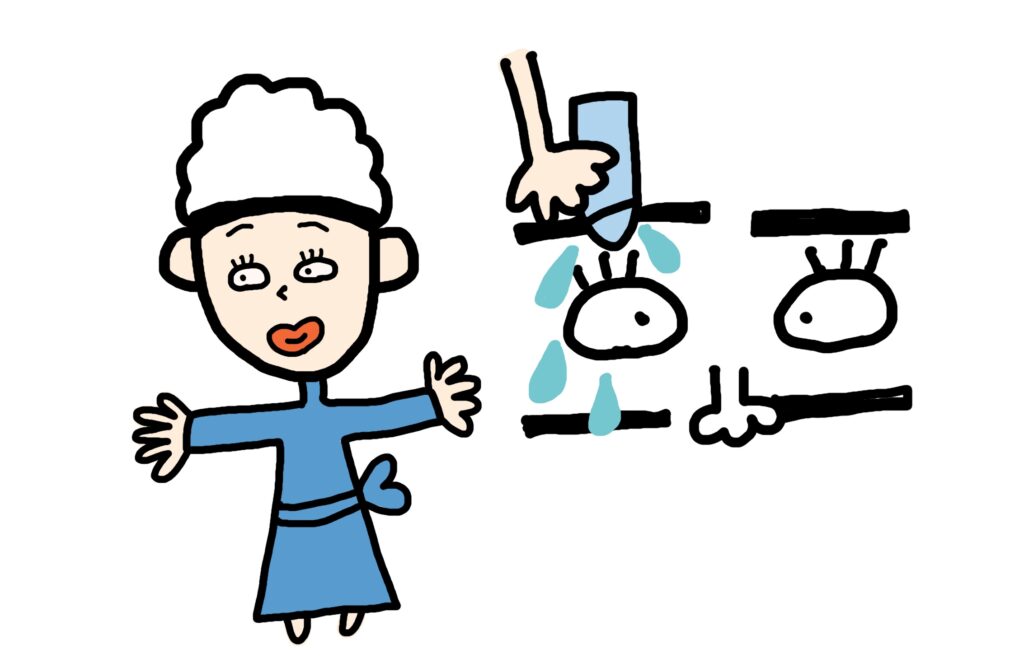手術当日、食事は軽めにとっても良いとのこと。眼孔を開く目薬や麻酔の目薬を差して、いよいよ手術…。想像していたより手術という感じでした。手術着を着て、帽子でがちがち(笑)一番怖かった事は手術台に乗ってから、先生の手で目をごしごし洗って消毒したこと!!こんな感じです(笑)